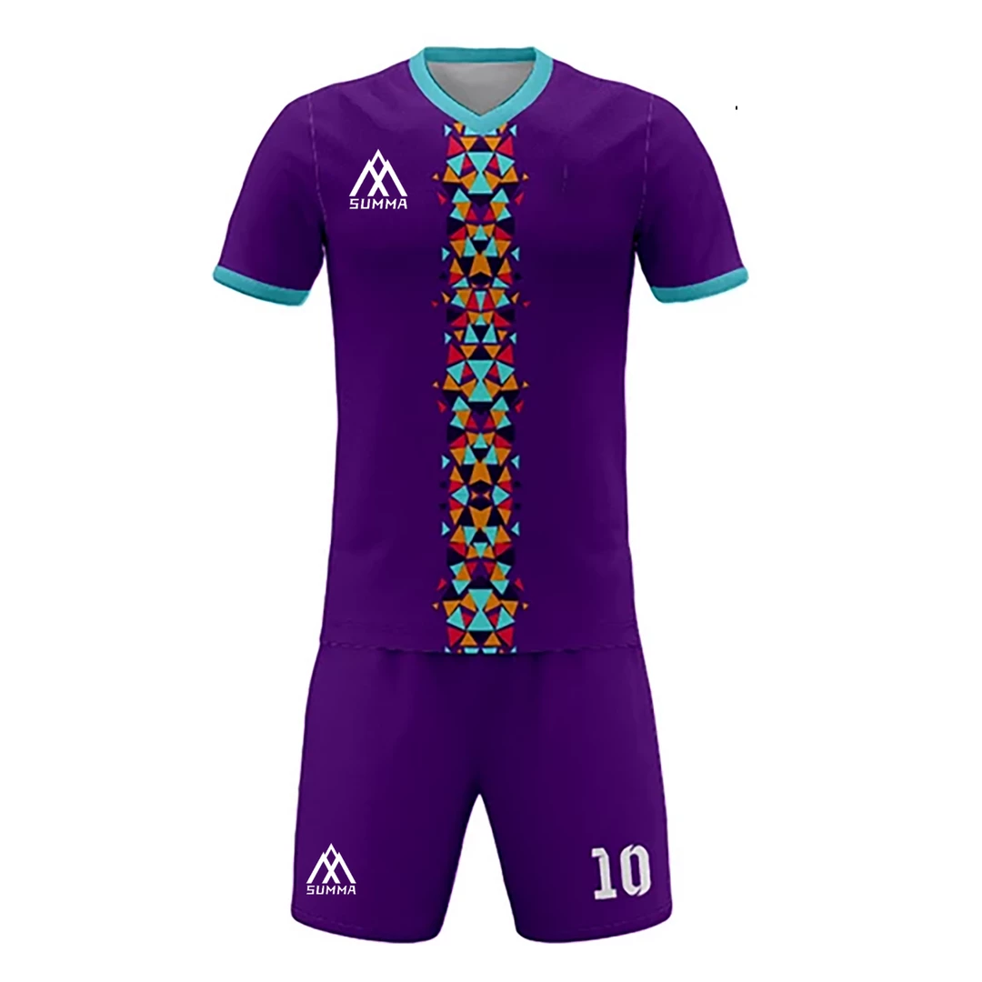 - Summa Drive Triangle Stripe Soccer Shirt and Short Sublimation Football Wear Violet/Light Blue With Triangle Design is made of beautiful and smooth 100% polyester material. It is very comfortable and breathable.